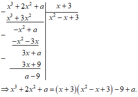 Tìm số thực \(a\) để đa thức \({x^3} + 2{x^2} + a\) chia hết cho đa thức \(x + 3.\)