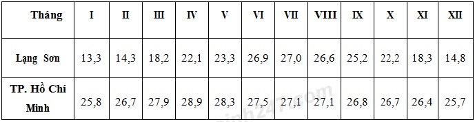 Cho bảng số liệu: Nhiệt độ trung bình tháng của Lạng Sơn và TP. Hồ Chí Minh (Đơn vị: