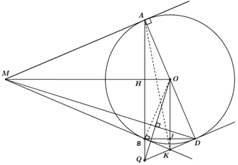 4) Đường thẳng qua \({\rm{O}}\) và vuông góc với \(MD\) cắt tia \(AB\) tại \(Q.\) Chứng minh \(K\) là trung điểm của \(DQ\).