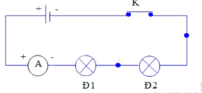 b) Vẽ sơ đồ mạch điện gồm một bộ nguồn dùng pin, hai bóng đèn mắc nối tiếp, một công tác đóng và một am pe kế để đo cường độ dòng điện trong mạch.