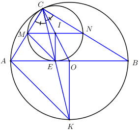 2) Cho đường tròn \(\left( I \right)\) đi qua điểm \(E\) và tiếp xúc với đường tròn \(\left( O \right)\) tại tiếp điểm \(C\), đường tròn \(\left( I \right)\) cắt \(CA,\,\,CB\) tại điểm thứ hai theo thứ tự là \(M,\,\,N\). Chứng minh rằng \(MN\) song song với \(AB\).
