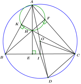 Cho tam giác \(ABC\) có ba góc nhọn nội tiếp trong đường tròn \(\left( {O;\,\,R} \right),\,\,\left( {AB < AC} \right).\) Ba đường cao \(AE,\,\,BF\) và \(CK\) của tam giác \(ABC\) cắt nhau tại \(H.\) Vẽ đường kính \(AD\) của đường tròn \(\left( {O;\,\,R} \right).\)