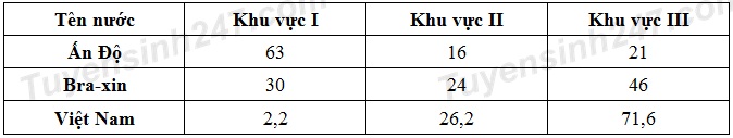 Cho bảng số liệu: TỈ LỆ LAO ĐỘNG THEO KHU VỰC KINH TẾ CỦA ẤN ĐỘ, BRAXIN VÀ VIỆT NAM NĂM