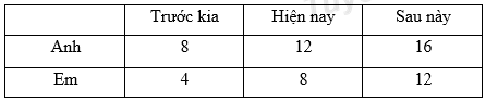 Từ tỉ số tuổi anh hiện nay = 3 lần tuổi em, ta có thể giả sử hiện nay anh 3 tuổi thì tuổi em trước kia là 1 tuổi. Từ đó tính số tuổi của em hiện nay, anh sau này và tổng số tuổi của hai anh em sau này.