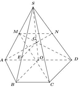b) Mặt phẳng \(\left( {MCD} \right)\) cắt \(SB\) tại \(E\). Tính tỉ số \(\dfrac{{SE}}{{EB}}\).