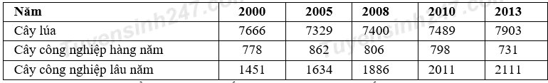 Cho bảng số liệu: DIỆN TÍCH MỘT SỐ CÂY TRỒNG CỦA NƯỚC TA GIAI ĐOẠN 2000 - 2013 (Đơn vị:
