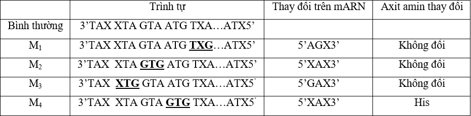 Một đoạn mạch làm khuôn tổng hợp mARN của alen M có trình tự nuclêôtit là 3’TAX XTA GTA ATG TXA…ATX5’. Alen M bị đột biến điểm tạo ra 4 alen có trình tự nuclêôtit ở đoạn mạch này như sau: