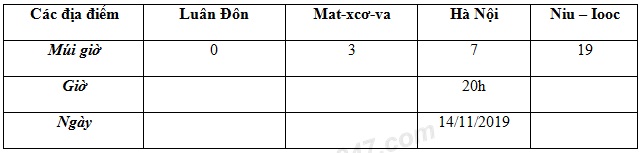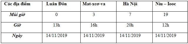 Trận đấu vòng loại World Cup 2022 giữa đội tuyển quốc gia Việt Nam và UAE diễn ra lúc 20h ngày 14 tháng 11 năm 2019 theo giờ Hà Nội. Hỏi lúc đó các địa điểm sau là mấy giờ và ngày nào?