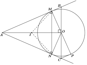 Từ điểm \(A\) nằm ngoài đường tròn \(\left( O \right)\) ta kẻ hai tiếp tuyến \(AM\) và \(AN\) đến đường tròn (\(M\) và \(N\) là tiếp điểm). Đường thẳng \(MO\) cắt đường tròn tại điểm \(P.\) Đường thẳng vuông góc với \(OA\) tại \(O\) cắt \(AN\) tại \(C\) và cắt \(AM\) tại \(B.\)