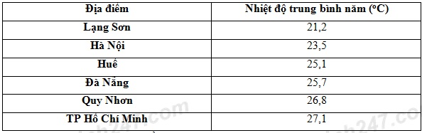 Cho bảng số liệu: NHIỆT ĐỘ TRUNG BÌNH NĂM TẠI MỘT SỐ ĐỊA ĐIỂM Ở NƯỚC TA (Nguồn Sách
