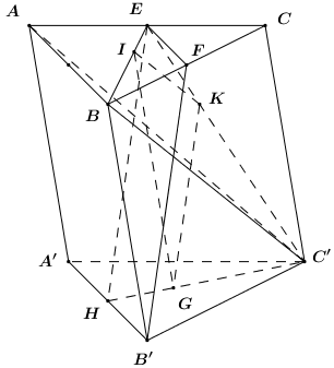 Cho lăng trụ tam giác \(ABC.A'B'C'.\) Gọi \(I,K,G\) lần lượt là trọng tâm các tam giác \(ABC,\,\,ACC',\,\,A'B'C'.\) Chứng minh \(IK\parallel \left( {ABC'} \right)\,\,;\,\,GK\parallel \left( {BB'C'C} \right)\).