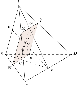 Cho tứ diện \(ABCD.\) Qua điểm \(M\) trên \(AC,\) ta dựng một mặt phẳng \(\left( \alpha \right)\) song song với \(AB\) và \(CD.\) \(\left( \alpha \right)\) lần lượt cắt các cạnh \(BC,BD,AD\) tại \(N,P,Q.\)