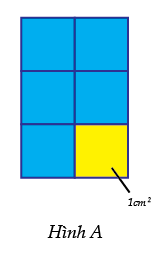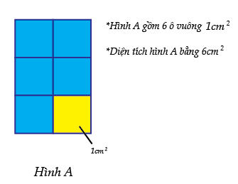 Hình A là chữ nhật gồm 6 ô vuông có diện tích \(1c{m^2}\). Nên diện tích hình A là \(6 \times 1 = 6\left( {c{m^2}} \right)\)