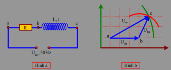 Để xác định độ tự cảm L và điện trở trong r của một cuộn dây, một học sinh mắc nối tiếp điện trở \(R = 10\,\,\Omega \) với cuộn dây như hình (hình a). Dùng vôn kế đo các điện áp trên mạch với các vị trí \({U_{ab}};\,\,{U_{bc}};\,\,{U_{ac}}\), sau đó giản đồ Frenen với các vec-tơ tương ứng theo đúng tỉ lệ như hình (hình b). Độ tự cảm và điện trở trong của cuộn dây trong thí nghiệm này gần giá trị nào nhất?