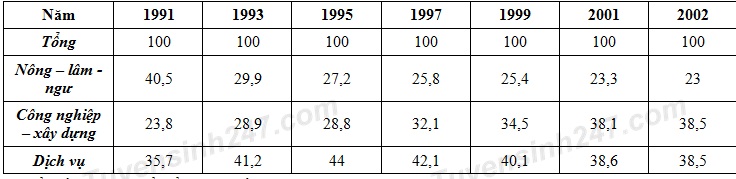 Cho bảng số liệu: Cơ cấu GDP của nước ta thời kì 1991 – 2002 (%)