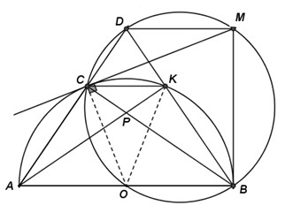 Trên nửa đường tròn \(\left( O \right)\) đường kính \(AB = 2r\) lấy điểm \(C\) khác \(A\) sao cho \(CA < CB\). Hai tiếp tuyến của nửa đường tròn \(\left( O \right)\) tại \(B,\,\,C\)cắt nhau tại \(M\). Tia \(AC\) cắt đường tròn ngoại tiếp \(\Delta MBC\)tại điểm thứ hai là \(D\). Gọi \(K\) là giao điểm thứ hai của \(BD\) và nửa đường tròn \(\left( O \right)\), \(P\) là giao điểm của \(AK\) và \(BC\). Biết rằng diện tích hai tam giác \(CPK\) và \(APB\) lần lượt là \(\dfrac{{{r^2}\sqrt 3 }}{{12}}\) và \(\dfrac{{{r^2}\sqrt 3 }}{3}\). Tính diện tích tứ giác \(ABKC\).