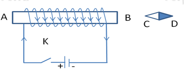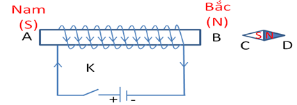 Cho mạch điện như hình 2. Khi đóng khóa K kim nam châm bị hút vào đầu B của ống dây.