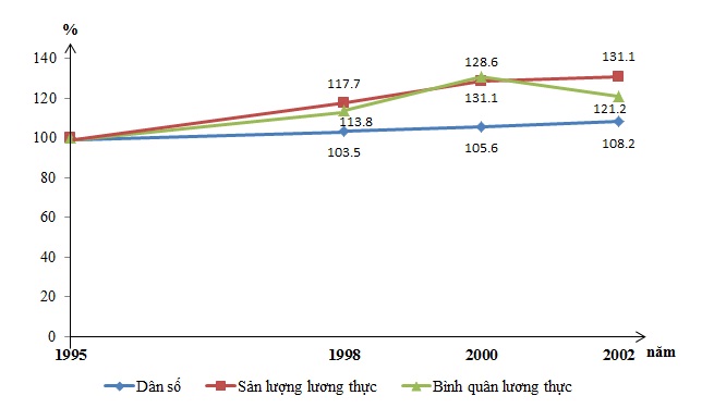b) Qua biểu đồ phân tích ảnh hưởng của việc giảm dân số tới bình quân lương thực đầu người ở ĐBSH?