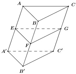 Cho lăng trụ \(ABC.A’B’C’\) . Gọi \(E, F, G\) lần lượt là trung điểm của \(AA’ , BB’, CC’\). Chứng minh rằng các lăng trụ \(ABC.EFG\) và \(EFG.A’B’C’\) bằng nhau.