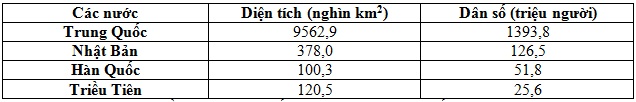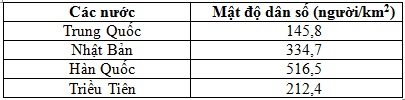 Dựa vào bảng số liệu, tính mật độ dân số các nước thuộc khu vực Đông Á