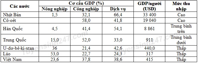Dựa vào bảng số liệu một số chỉ tiêu kinh tế - xã hội ở một số nước châu Á năm 2001,