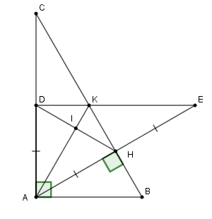 c) Trên tia đối của tia \(HA\) lấy điểm \(E\) sao cho \(HE = AH\). Chứng minh \(HB = HK\) và ba điểm \(D,K,E\) thẳng hàng.