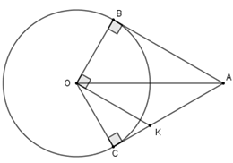Cho \(\left( {O;R} \right),\) lấy điểm \(A\) cách \(O\) một khoảng bằng \(2R.\) Kẻ các tiếp tuyến \(AB\) và \(AC\) với đường tròn (\(B,C\) là các tiếp điểm). Đường thẳng qua \(O\) và vuông góc với \(OB\) cắt \(AC\) tại \(K.\)