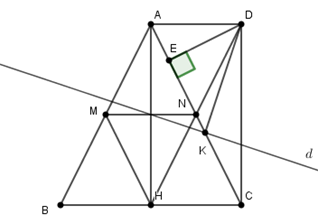 c) Kẻ \(DE \bot AC,\) gọi \(K\) là trung điểm của \(EC.\) Qua \(K\) vẽ đường thẳng \(d \bot DK.\) Chứng minh: Ba đường thẳng \(AH,MN\) và \(d\) đồng qui (cùng gặp nhau tại 1 điểm)