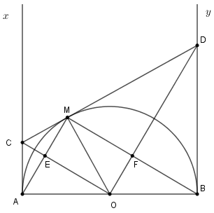 Cho nửa đường tròn tâm \(O\), đường kính \(AB = 2R\). Trên nửa mặt phẳng có bờ là \(AB\) chứa nửa đường tròn, vẽ tiếp tuyến \(Ax,\,\,By\). Từ điểm \(M\) tùy ý thuộc nửa đường tròn (\(M\)khác \(A,B\)) vẽ tiếp tuyến tại \(M\) cắt \(Ax,\,\,By\) lần lượt tại \(C,\,\,D\). Gọi \(E\) là giao điểm của \(CO\) và \(AM\), \(F\)là giao điểm của \(DO\) và \(BM\).