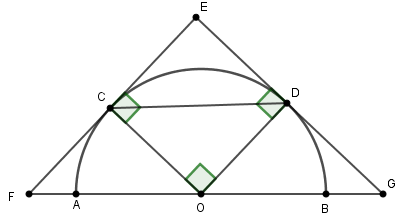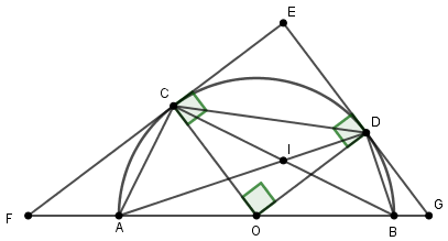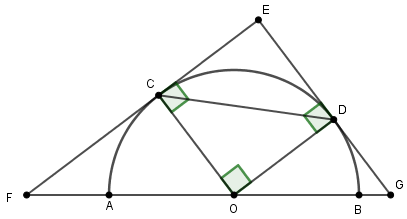 Cho nửa đường tròn \(\left( {O;R} \right)\) đường kính \(AB.\) Gọi \(C,D\) là hai điểm di chuyển trên cung tròn sao cho góc \(COD\) luôn bằng \(90^\circ \) (\(C\) nằm giữa \(A\) và \(D\)). Tiếp tuyến tại \(C,D\) cắt đường thẳng \(AB\) lần lượt tại \(F,G.\) Gọi \(E\) là giao điểm của \(FC\) và \(GD.\)