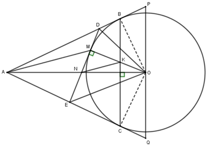 c) Đường thẳng vuông góc với \(AO\) tại \(O\) cắt \(AB\) và \(AC\) lần lượt tại \(P\) và \(Q.\) Chứng minh : \(4PD.QE = P{Q^2}.\)