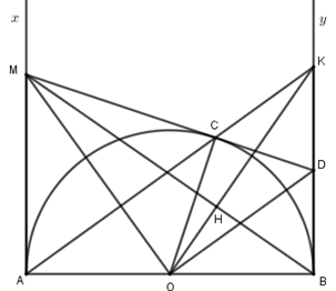 Cho nửa đường tròn \(\left( {O;R} \right)\) đường kính \(AB.\) Vẽ hai tiếp tuyến \(Ax,\,By\) với nửa đường tròn đó. Trên tia \(Ax\) lấy điểm \(M\) sao cho \(AM > R.\) Từ \(M\) kẻ tiếp tuyến \(MC\) với nửa đường tròn \(\left( O \right)\) (\(C\) là tiếp điểm). Tia \(MC\) cắt tia \(By\) tại \(D.\)