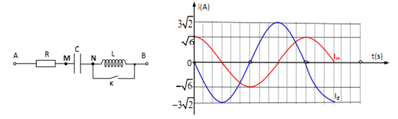 Cho mạch điện như hình vẽ. Điện áp xoay chiều ổn định giữa hai đầu A và B là \(u = 100\sqrt 6 .\cos \left( {\omega t + \varphi } \right)\,\left( V \right)\). Khi K mở hoặc đóng, thì đồ thị cường độ dòng điện qua mạch theo thời gian tương ứng là \({i_m}\)và \({i_d}\) được biểu diễn như hình vẽ. Điện trở các dây nối rất nhỏ. Giá trị của điện trở R bằng: