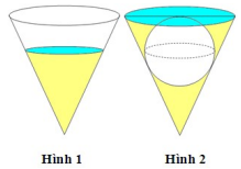 Một cái phễu có dạng hình nón, có thiết diện qua trục là tam giác đều cạnh \(a = 30\,\,cm\). Người ta đổ một lượng nước vào phễu sao cho chiều cao của cột nước trong phếu bằng \(h\,\,\,\left( {0 < h < 15\sqrt 3 cm} \right)\)(hình H1). Sau đó, người ta đặt một quả bóng nhựa nội tiếp cái phễu thì thấy mực nước dâng lên vừa đúng miệng phễu( hình H2). Tính chiều cao \(h\) của cột nước lúc đầu.