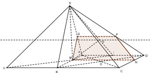 3) Mặt phẳng \(\left( \alpha \right)\) đi qua \(M\) và song song với \(AD\) và \(SB\), \(\left( \alpha \right)\) cắt các cạnh \(CD,\,\,SD,\,\,SA\) lần lượt tại các điểm \(N,\,\,P,\,\,Q\).
