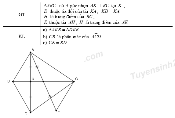 Cho tam giác \(ABC\)có \(3\) góc nhọn. Kẻ \(AK\) vuông góc với \(BC\)(\(K\) thuộc \(BC\)). Trên tia đối của tia \(KA\) lấy điểm \(D\) sao cho \(KD = KA\).