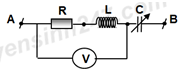 Cho mạch điện như hình vẽ. Đặt vào mạch điện hiệu điện thế xoay chiều \({u_{AB}} = 200\sqrt 2 \cos 100\pi t\,\,V\). Mạch điện có \(R = 100\,\,\Omega \); \(L = \dfrac{1}{\pi }\,\,H\); C là tụ điện có điện dung thay đổi; vôn kế có điện trở vô cùng lớn. Tìm C để vôn kế V có số chỉ lớn nhất. Tính giá trị lớn nhất đó.