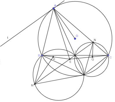 c) Tia phân giác của góc \(\angle BAC\)cắt \(MN\) tại \(E\). Tia phân giác của các góc \(\angle BME\) và \(\angle CNE\) lần lượt cắt \(BE,\,\,CE\) tại \(P,\,\,Q.\) Chứng minh \(PB.QE = PE.QC\)