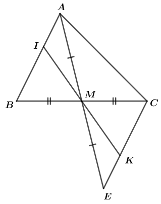 Cho tam giác \(ABC,\) gọi \(M\) là trung điểm của \(BC.\) Trên tia \(AM\) lấy điểm \(E\) sao cho \(M\) là trung điểm của \(AE.\)