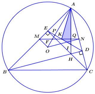 c) Gọi \(K\) là giao điểm của\(ED\) và \(MN,\,\,F\) là giao điểm của \(AO\) và \(MN,\,\,I\) là giao điểm của \(ED\) và \(AH.\) Chứng minh \(F\) là trực tâm \(\Delta KAI.\)