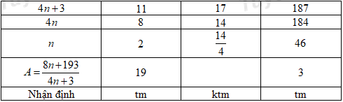Tìm số tự nhiên \(n\) để phân số \(A = \frac{{8n + 193}}{{4n + 3}}\):