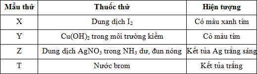 Kết quả thí nghiệm của các dung dịch X, Y, Z, T với thuốc thử được ghi ở bảng sau: