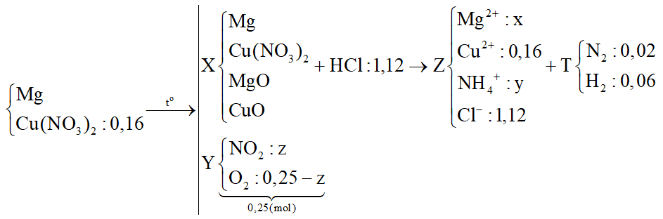 Nhiệt phân hỗn hợp gồm Mg và 0,16 mol Cu(NO3)2 trong điều kiện không có không khí, sau một thời gian, thu được hỗn hợp rắn X và 5,6 lít (đktc) hỗn hợp khí Y gồm NO2 và O2. Hòa tan hoàn toàn X cần dùng vừa đủ dung dịch chứa 1,12 mol HCl, thu được dung dịch Z và 0,08 mol hỗn hợp khí T gồm hai đơn chất khí. Tỉ khối của T so với He bằng 2,125. Cô cạn dung dịch Z thu được m gam muối khan. Giá trị của m là