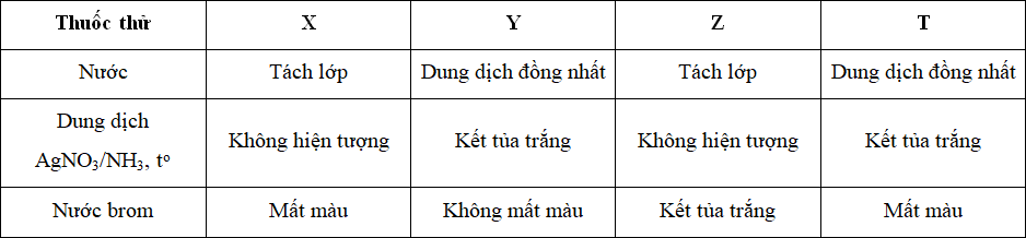 Tiến hành thí nghiệm với các chất X, Y, Z kết quả được trình bày trong bảng dưới đây: