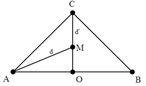 Trên mặt nước ba nguồn sóng có phương trình lần lượt là: \({u_1} = 2a.\cos \omega t;\)\({u_2} = 3a.\cos \omega t;{u_3} = 4a.\cos \omega t\) đặt tại A, B và C sao cho tam giác ABC vuông cân tại C và \(AB=12cm\). Biết biên độ sóng không đổi và bước sóng lan truyền \(2cm\). Điểm M trên đoạn CO (O là trung điểm AB) cách O một đoạn ngắn nhất bằng bao nhiêu thì nó dao động với biên độ \(9a\):