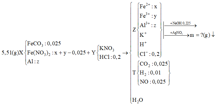 Hòa tan hết 5,51 gam hỗn hợp X gồm FeCO3, Fe(NO3)2 và Al vào dung dịch Y chứa KNO3 và 0,2 mol HCl, thu được dung dịch Z và 1,344 lít (đktc) khí T gồm CO2, H2 và NO (có tỷ lệ khối lượng tương ứng là 110 : 2 : 75). Dung dịch Z phản ứng được tối đa với 0,225 mol NaOH. Nếu cho Z tác dụng với dung dịch AgNO3 dư thì thu được m gam kết tủa. Biết các phản ứng xảy ra hoàn toàn và NO là sản phẩm khử duy nhất của N+5 trong các phản ứng trên. Giá trị của m gần nhất với giá trị nào dưới đây?