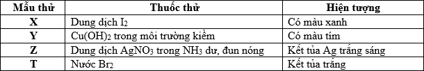 Kết quả thí nghiệm của các dung dịch X, Y, Z, T với thuốc thử được ghi ở bảng sau: