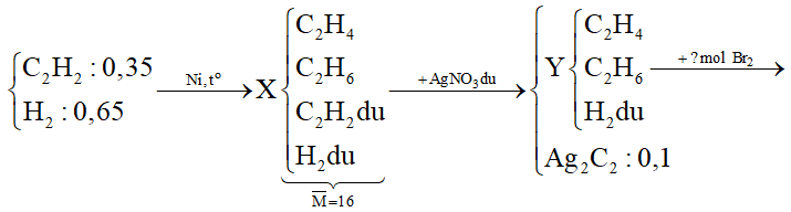 Trong một bình kín chứa 0,35 mol C2H2; 0,65 mol H2 và một ít bột Ni. Nung nóng bình một thời gian, thu được hỗn hợp khí X có tỉ khối so với H2 bằng 8. Sục X vào lượng dư dung dịch AgNO3, trong NH3, đến phản ứng hoàn toàn thu được hỗn hợp khí Y và 24 gam kết tủa. Hỗn hợp khí Y phản ứng vừa đủ với x mol Br2 trong dung dịch. Giá trị của x là