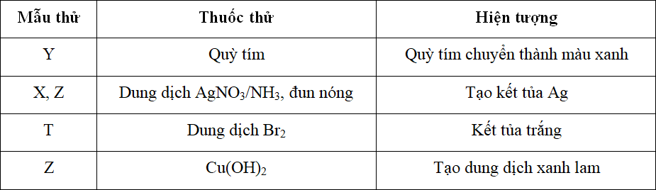 Tiến hành thí nghiệm với các dung dịch X, Y, Z, T. Kết quả được ghi ở bảng sau: X, Y, Z, T