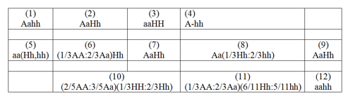 Biết rằng hai cặp gen qui định hai tính trạng nói trên không cùng nằm trong một nhóm gen liên kết: bệnh hói đầu do alen trội H nằm trên NST thường qui định, kiểu gen dị hợp Hh biểu hiện hói đầu ở người nam và không hói đầu ở người nữ và quần thể này ở trạng thái cân bằng và có tỉ lệ người bị hói đầu là 20%.